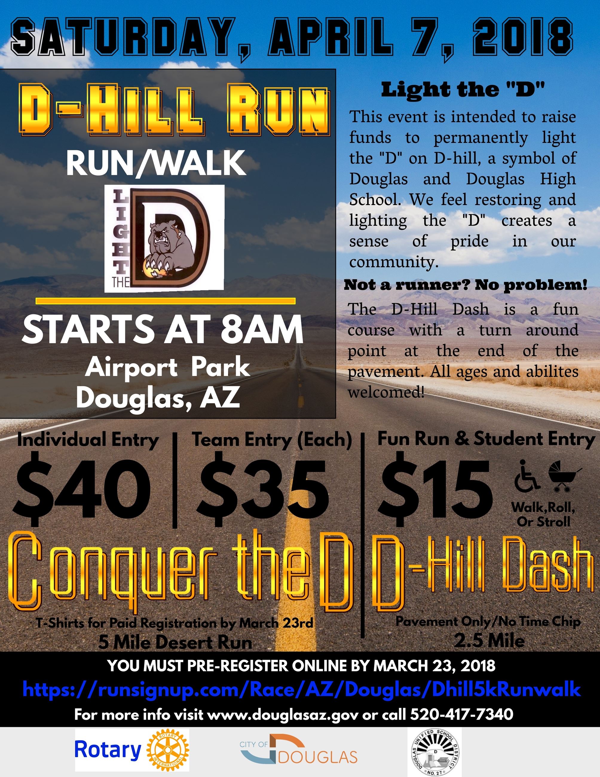 The Conquer the D Run is a 5 mile desert run. T-Shirts will be provided for Conquer the D racers who have a pre-paid registration by March 23rd.